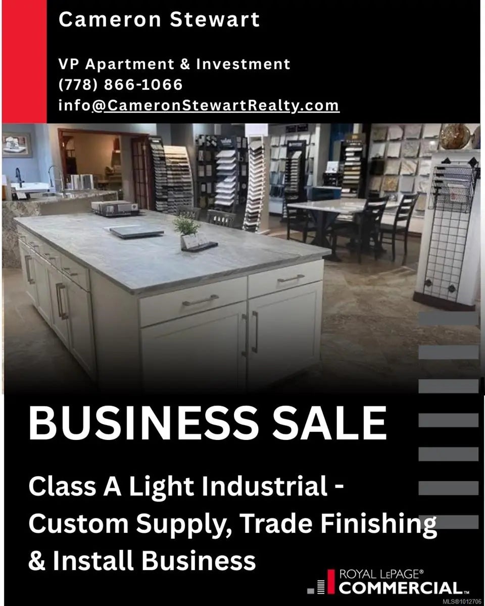 Class A Service Light Industrial - Custom Supply, Trade Finishing and Install Well positioned small business within Victoria’s B2C residential custom trade-supply vertical. Extremely loyal clientele; promotion is solely word-of-mouth with huge revenue upside for new owners to begin advertising. Situated downtown in M-2 industrial zoning; client + staff parking, 2 delivery and loading bays 10’ and 14’ garages, respectively. 3000SF Premises are A/B Industrial Commercial; seamless takeover; no updates required. Turn-key operational package including: Zhengda ZDH-600 Bridge Saw, Toyota 5FGC25 Fork-lift, Finishing Equipment, Comprehensive Client List. Inventory, 2 Vehicles, Showroom, Office, 2 washrooms, Staff Area, Plus Storage! 3 year lease term with 1 renewal option for 2027. Transferable subject to approval of Landlord. Perfect for Owner Operator or Family Business. Transfer of ownership training and consultation. Huge growth potential in vertical. Inquire for details with NDA.