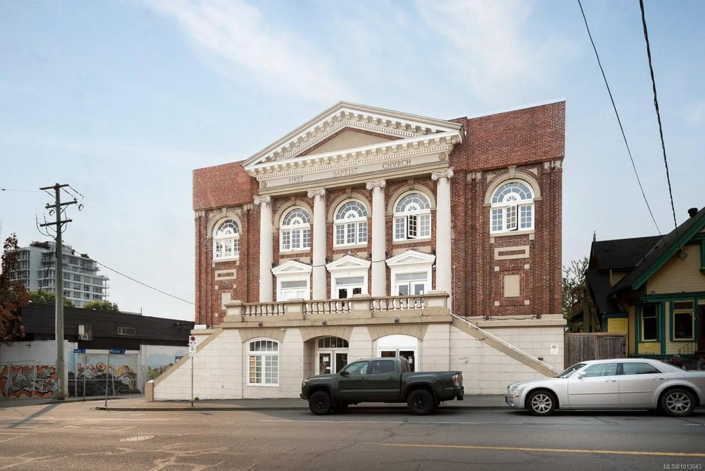 Stunning wooden beams, soaring ~18' vaulted ceilings, and the most beautiful windows in this two story top level loft that feels like a penthouse! Welcome to The Palladium. A heritage conversion with character and style. This home offers open living/dining, a flex bedroom/office, a full bath on the main, a lofted primary retreat with ensuite + walk-in. Upgrades include a sleek glass-door shower and premium designer fan. This heritage jaw dropper comes with in-suite laundry, secure bike storage, and a stunning rooftop that's made for BBQs and sunsets. The building is pet friendly and rental friendly, and has proven long-term investment income, along with past historical short term rental eligibility. Optional furnishings make this an easy turn-key purchase. Cafés, theatres, groceries at your doorstep, with bikes, transit, and car-share all close by. This is where volume, light, and lifestyle meet — a rare chance in the heart of Victoria.