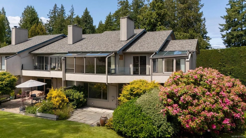 OH SUN 2PM-4PM - Welcome to Turgoose Point Estates, an exclusive oceanside community offering panoramic views, lush gardens, and private beach access for an exceptional coastal lifestyle. This 3BD/3BA, 1935 sq ft end-unit townhome showcases relaxed sophistication with thoughtful updates throughout. The remodeled galley kitchen features granite counters, stainless appliances, glass tile backsplash, and a cheerful breakfast nook. Soaring 15’ vaulted ceilings, hardwood floors, and a wood-burning fireplace create a warm, light-filled ambiance. Enjoy the sunny patio framed by colourful blooms or savour ocean vistas from your private sheltered balcony. Updated baths, generous storage, and a 2-car garage ensure comfort and convenience. Recent exterior updates include roof, skylights, and paint. Ideally located near Sidney, BC Ferries, airport, and Victoria—just minutes to shops, dining, trails, and recreation. Vacant and move-in ready—embrace the serenity of seaside living today!
